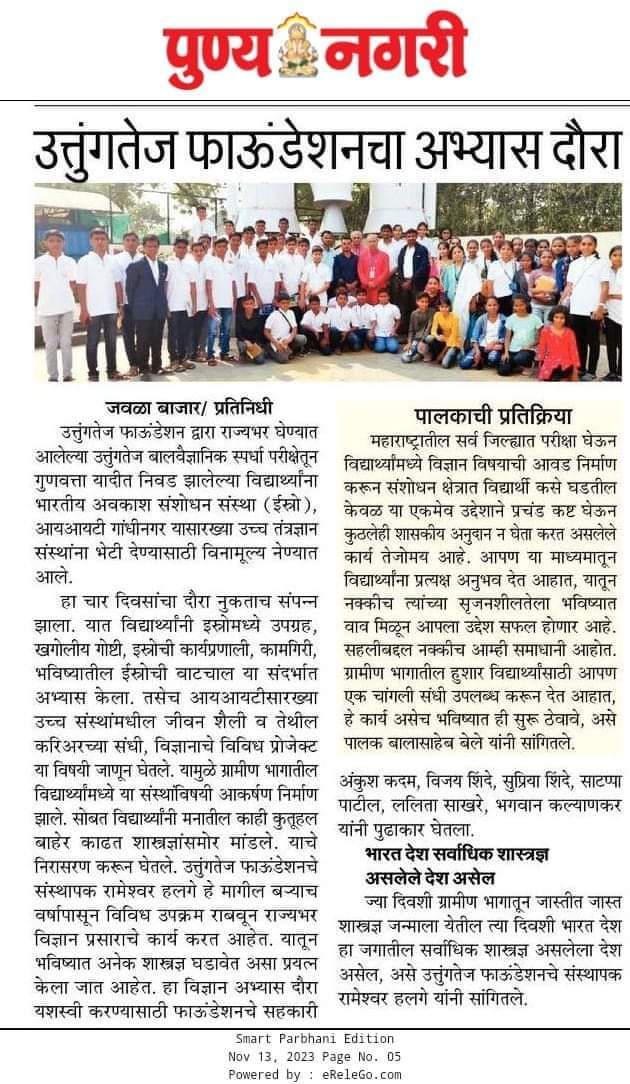 рд╡рд┐рджреНрдпрд╛рд░реНрдереА рдорд┐рддреНрд░рд╛рдВрдиреЛ рд╕рдзреНрдпрд╛рдЪреЗ рдпреБрдЧ рд╣реЗ рд╡рд┐рдЬреНрдЮрд╛рди рдЖрдгрд┐ рддрдВрддреНрд░рдЬреНрдЮрд╛рдирд╛рдЪреЗ рдпреБрдЧ рдЖрд╣реЗ рддреНрдпрд╛рдЪрдмрд░реЛрдмрд░ рд╕реНрдкрд░реНрдзреЗрдЪреЗ рджреЗрдЦреАрд▓ рдЖрд╣реЗ рджрд┐рд╡рд╕реЗрдВрджрд┐рд╡рд╕ рд╡рд┐рдЬреНрдЮрд╛рди рдкреНрд░рдЧрддреА рдХрд░рдд рдЖрд╣реЗ рдкрд░рдВрддреБ рдЧреНрд░рд╛рдореАрдг рднрд╛рдЧ рдЕрдЬреВрдирд╣реА рд╡рд┐рдЬреНрдЮрд╛рдирд╛рдкрд╛рд╕реВрди рд╡рдВрдЪрд┐рдд рдЖрд╣реЗ рдпрд╛ рджреГрд╖реНрдЯрд┐рдХреЛрдирд╛рддреВрди рдмрд╛рд▓рдордирд╛рд╡рд░ рд╡рд┐рдЬреНрдЮрд╛рди рдЙрдЪреНрдЪрд╡рд┐рдгреНрдпрд╛рд╕рд╛рдареА рд╢рд╛рд▓реЗрдп рдЬреАрд╡рдирд╛рдкрд╛рд╕реВрди рддрдпрд╛рд░реА рдЧрд░рдЬреЗрдЪреА рдЖрд╣реЗ рддреНрдпрд╛рдореБрд│реЗ рдЙрддреНрддреБрдВрдЧрддреЗрдЪ рдлрд╛рдЙрдВрдбреЗрд╢рди рдорд╛рд░реНрдлрдд рдЙрддреНрддреБрдВрдЧрддреЗрдЬ рдмрд╛рд▓ рд╡реИрдЬреНрдЮрд╛рдирд┐рдХ рд╕реНрдкрд░реНрдзрд╛ рдкрд░реАрдХреНрд╖реЗрдЪреЗ рдЖрдпреЛрдЬрди рдХрд░рдгреНрдпрд╛рдд рдЖрд▓реЗ рдЖрд╣реЗ рдХрд╛рд░рдг рдпрд╛ рдкрд░реАрдХреНрд╖реЗрдореБрд│реЗ рд╡рд┐рджреНрдпрд╛рд░реНрдереНрдпрд╛рдВрдордзреНрдпреЗ рд╡рд┐рдЬреНрдЮрд╛рдирд╛рдЪреА рдЖрд╡рдб рдирд┐рд░реНрдорд╛рдг рд╣реЛрдКрди рджреЗрд╢рд╛рд╕рд╛рдареА рд╡рд┐рдЬреНрдЮрд╛рдирд╡рд╛рджреА рдкрд┐рдвреНрдпрд╛ рдШрдбрд╡рдгреНрдпрд╛рд╕ рдорджрдд рд╣реЛрдИрд▓ рдпрд╛ рдЙрджреНрджреЗрд╢рд╛рдиреЗ рдЗрдпрддреНрддрд╛ рдкрд╛рдЪрд╡реА рддреЗ рдмрд╛рд░рд╛рд╡реА рдкрд░реНрдпрдВрддрдЪреНрдпрд╛ рд╡рд┐рджреНрдпрд╛рд░реНрдереНрдпрд╛рдВрд╕рд╛рдареАрдЪреА рд╣реА рдкрд░реАрдХреНрд╖рд╛ рдЖрд╣реЗ. рдпрд╛ рдкрд░реАрдХреНрд╖реЗрдЪреНрдпрд╛ рдорд╛рдзреНрдпрдорд╛рддреВрди рд╡рд┐рджреНрдпрд╛рд░реНрдереНрдпрд╛рдВрдирд╛ рднрд╛рд░рддреАрдп рдЕрд╡рдХрд╛рд╢ рд╕рдВрд╢реЛрдзрди рд╕рдВрд╕реНрдерд╛ (рдЗрд╕реНрд░реЛ),рдЖрдпрдЖрдпрдЯреА, рдЖрдпрдЖрдпрдПрдо рдпрд╛рд╕рд╛рд░рдЦреНрдпрд╛ рдЙрдЪреНрдЪ рд╕рдВрд╕реНрдерд╛рдВрдирд╛ рд╡рд┐рдирд╛рдореВрд▓реНрдп рд╕рд╣рд▓реАрд▓рд╛ рдиреЗрдгреНрдпрд╛рдд рдпреЗрддреЗ. рдкреБрд╕реНрддрдХреЗ рд╡ рд╡рд┐рдЬреНрдЮрд╛рди рд╕рд╛рд╣рд┐рддреНрдп рдмрдХреНрд╖реАрд╕ рд╕реНрд╡рд░реВрдкрд╛рдд рджреЗрдгреНрдпрд╛рдд рдпреЗрддреЗ.